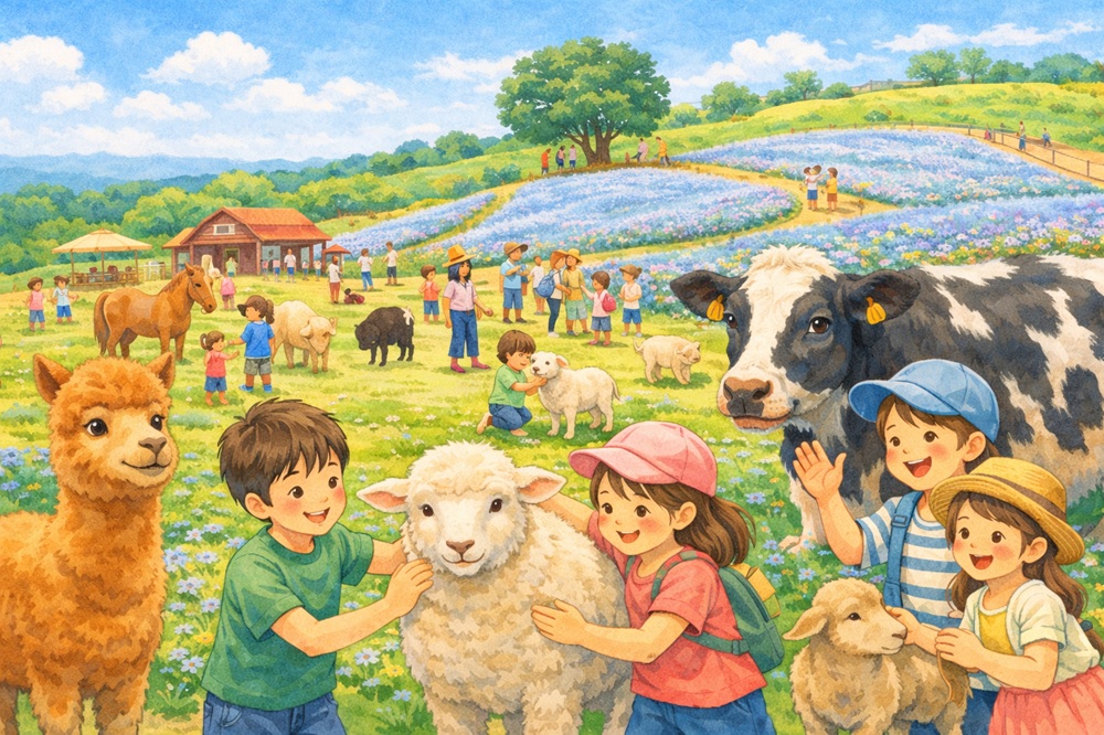 広大な牧場の緑と、のびのびと過ごす動物たちを家族みんなで感じてみてください。