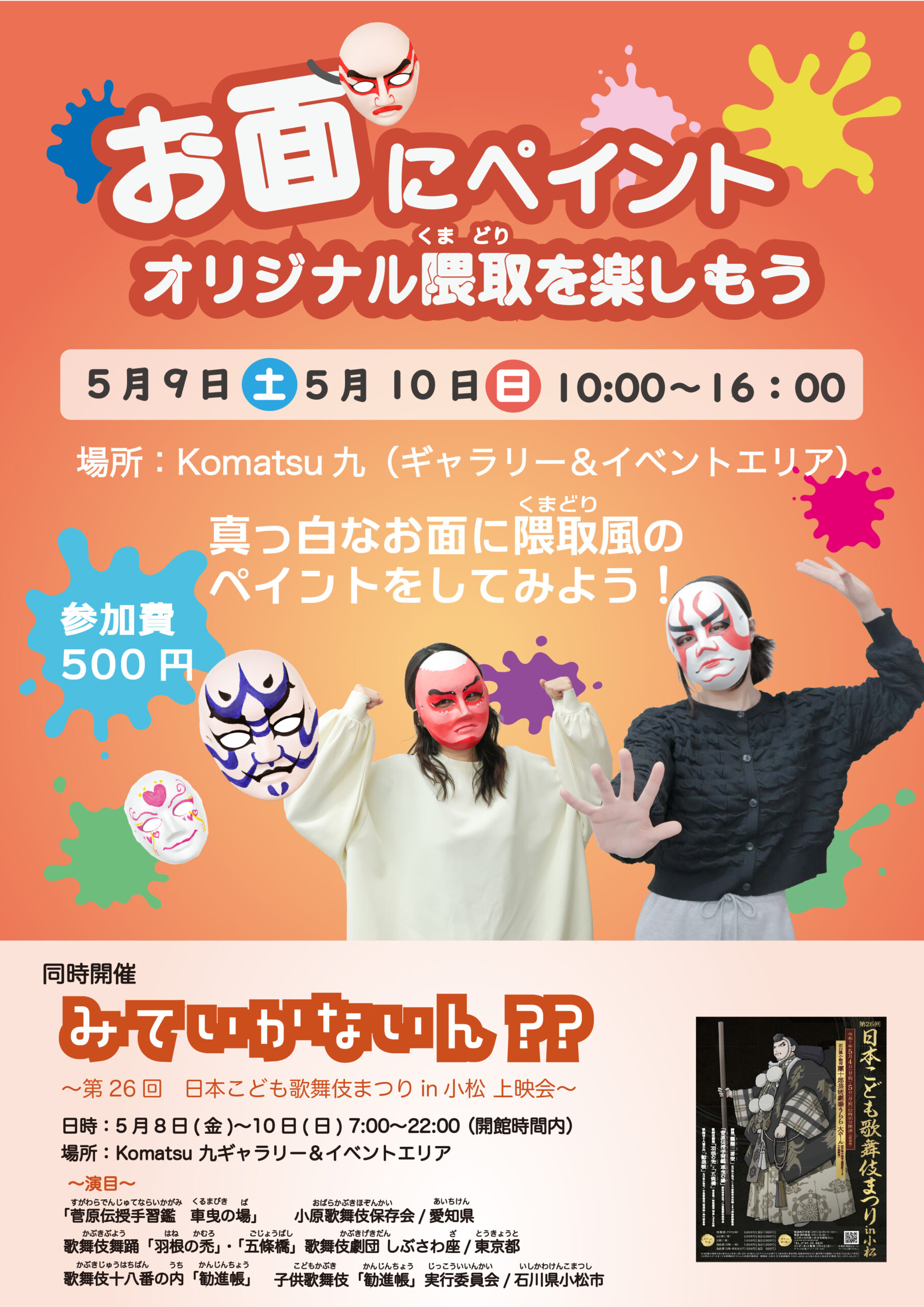 5月9日・10日はKomatsu九で隈取風ペイント体験、5月9日は市民公園周辺でカブッキーふわふわも予定されています。